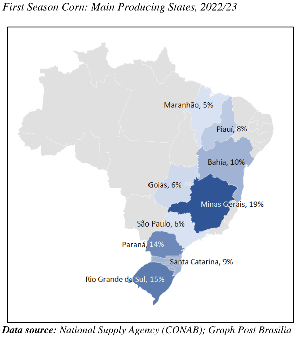 - Mapy stanów produkujących pierwszy oraz drugi zbiór kukurydzy w Brazylii w sezonie 2022/23 (USDA):