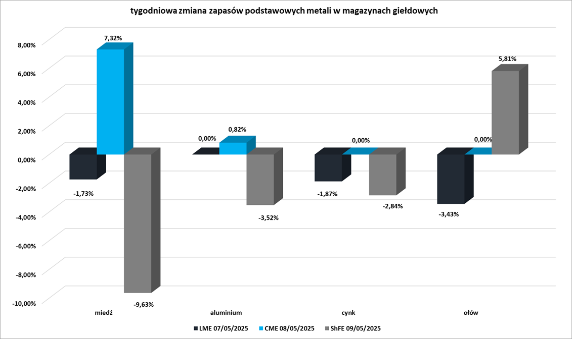 - Tygodniowe zmiany zapasów kluczowych metali przemysłowych w magazynach giełd CME (NYMEX & COMEX), szanghajskiej (ShFE) i londyńskiej (LME) giełdy: