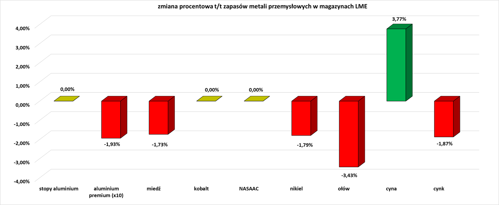 - Zapasy metali przemysłowych w magazynach Londyńskiej Giełdy Metali (LME):