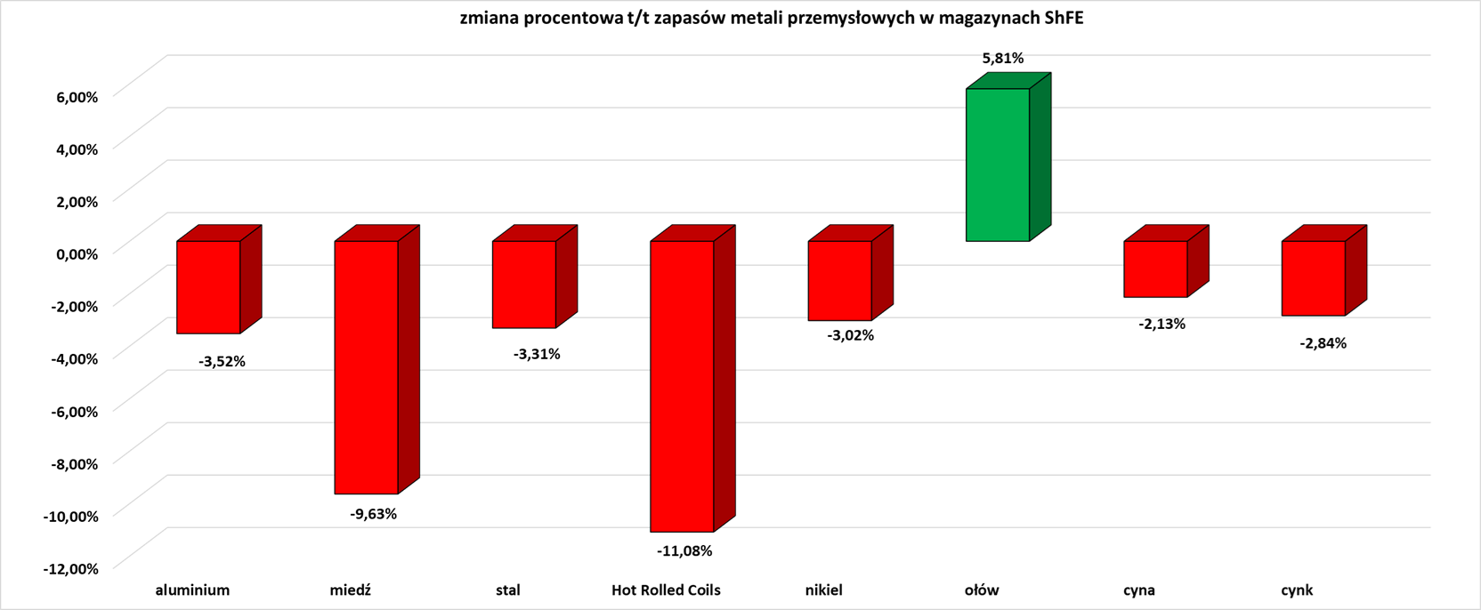 - Zapasy metali przemysłowych w magazynach Szanghajskiej Giełdy (ShFE):