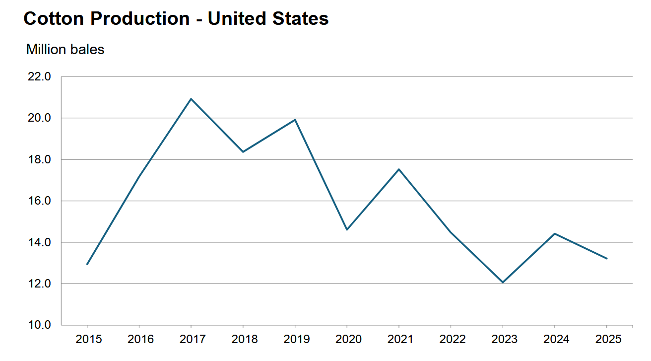 - Produkcja bawełny w USA w latach 2015 – 2025 (USDA):