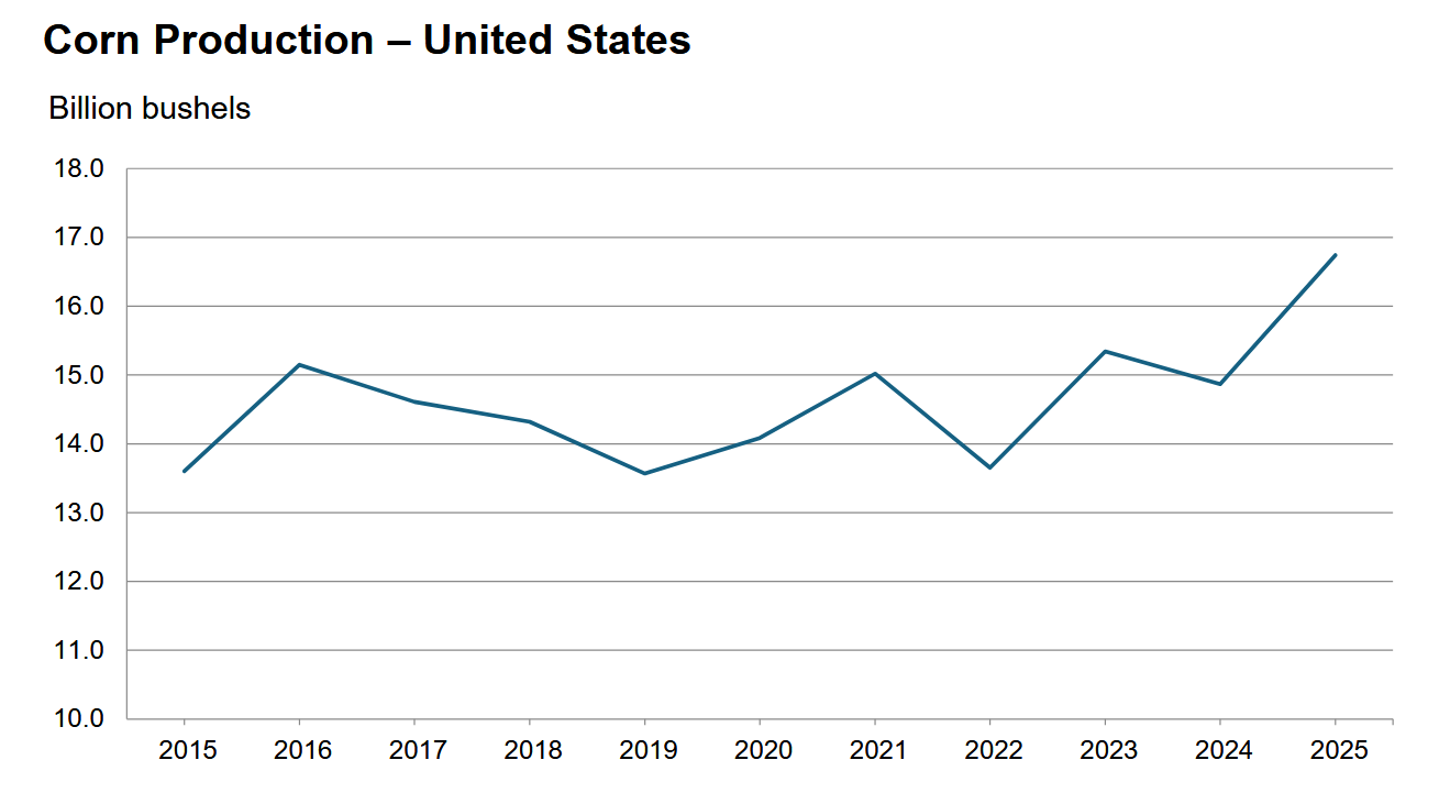 - Produkcja kukurydzy w USA w latach 2015 – 2025 (USDA):