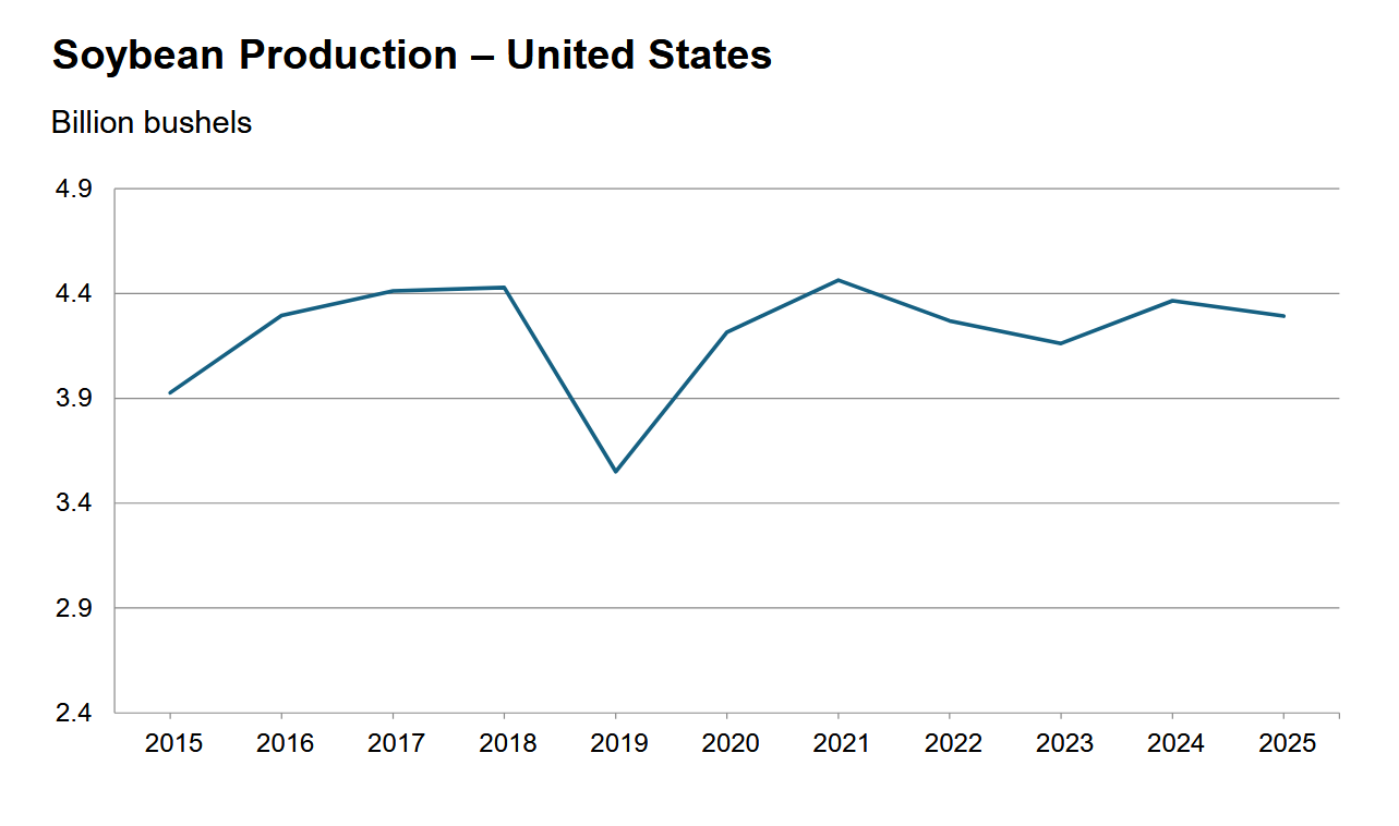 - Produkcja soi w USA w latach 2015 – 2025 (USDA):