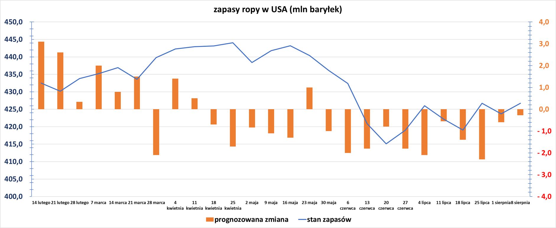 - Zapasy ropy naftowej w USA w tygodniu do 8 sierpnia zmieniły się o +3,0 mln baryłek, do 426,7 mln baryłek, prognozowano zmianę o -0,275 mln baryłek. Poniższy wykres pokazuje zmianę zapasów ropy w USA w ciągu ostatnich 26 tygodni:
