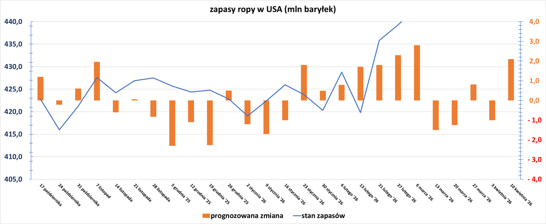 - Zapasy ropy naftowej w USA w Strategicznych Rezerwach Ropy Naftowej (SPR) wynosiły 409,2 mln baryłek w tygodniu zakończonym 10 kwietnia 2026 (-4,1 mln bbl/t; +3,07% r/r).