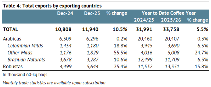- International Coffee Organization (ICO) informuje, że globalny eksport kawy w grudniu 2025 wyniósł 11,94 mln worków (+10,5% r/r). Wzrost eksportu nastąpił z Azji i Oceanii (+38,4% r/r), Afryki (+13,3% r/r) oraz Ameryki Środkowej i Meksyku (+81,3% r/r), natomiast eksport z Ameryki Południowej spadł (-15,0% r/r). Dane za eksport w grudniu oraz pierwsze trzy miesiące sezonu 2025/26 w porównaniu do sezonu 2024/25.