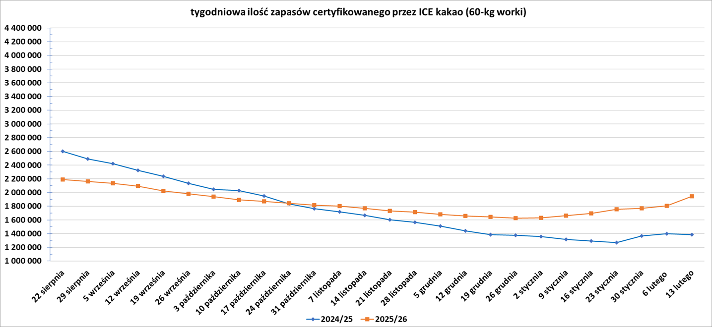 - Zapasy kakao w magazynach ICE wzrosły siódmy tydzień z rzędu (+137,57k t/t), w poprzednim sezonie zmiana wynosiła -14,9k t/t. Zapasy są w tym sezonie o +40,44% s/s wyższe.