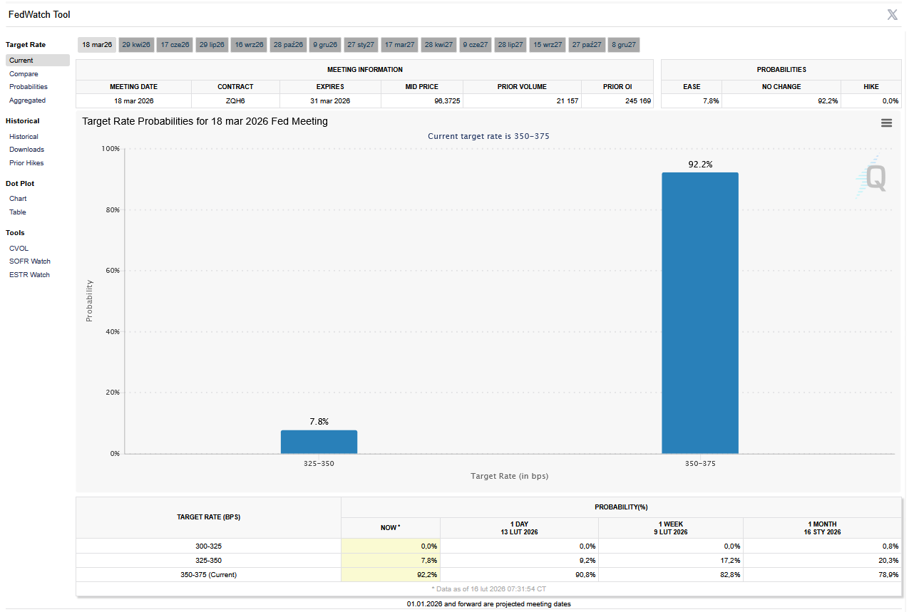 - FedWatch Tool (CME) na dzień 16 lutego 2026 dla marcowego posiedzenia FOMC: