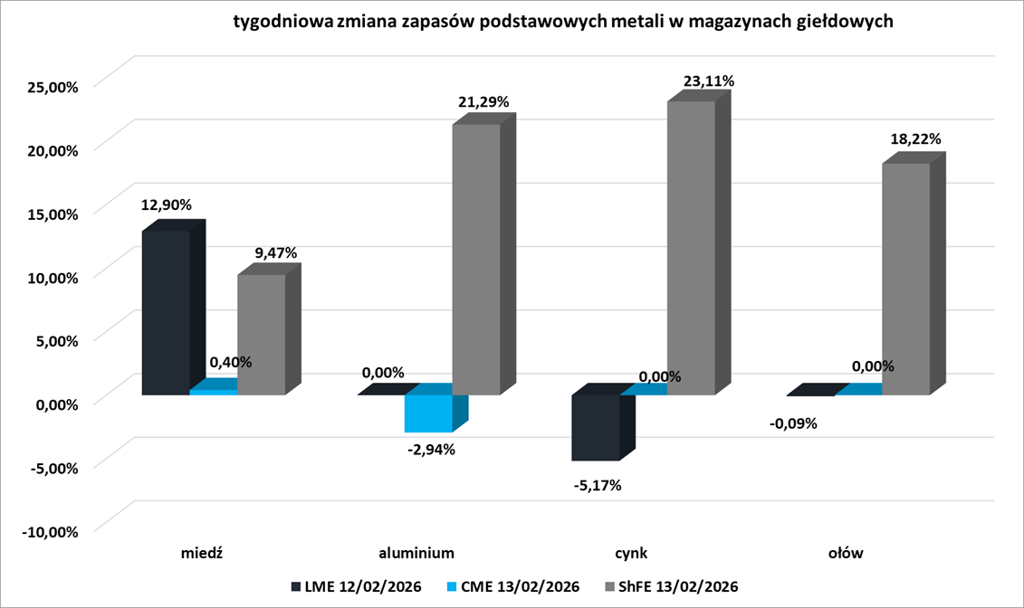 - Tygodniowe zmiany zapasów kluczowych metali przemysłowych w magazynach giełd CME (NYMEX & COMEX), szanghajskiej (ShFE) i londyńskiej (LME) giełdy: