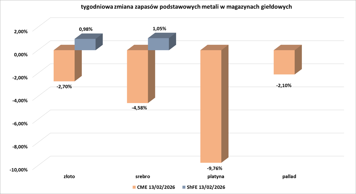 - Tygodniowe zmiany zapasów metali szlachetnych w magazynach giełd CME (NYMEX & COMEX) i szanghajskiej (ShFE):