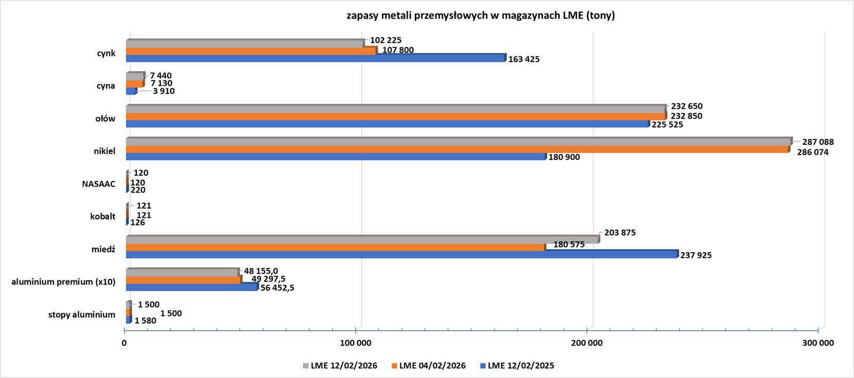 - Zapasy metali przemysłowych w magazynach Londyńskiej Giełdy Metali (LME):