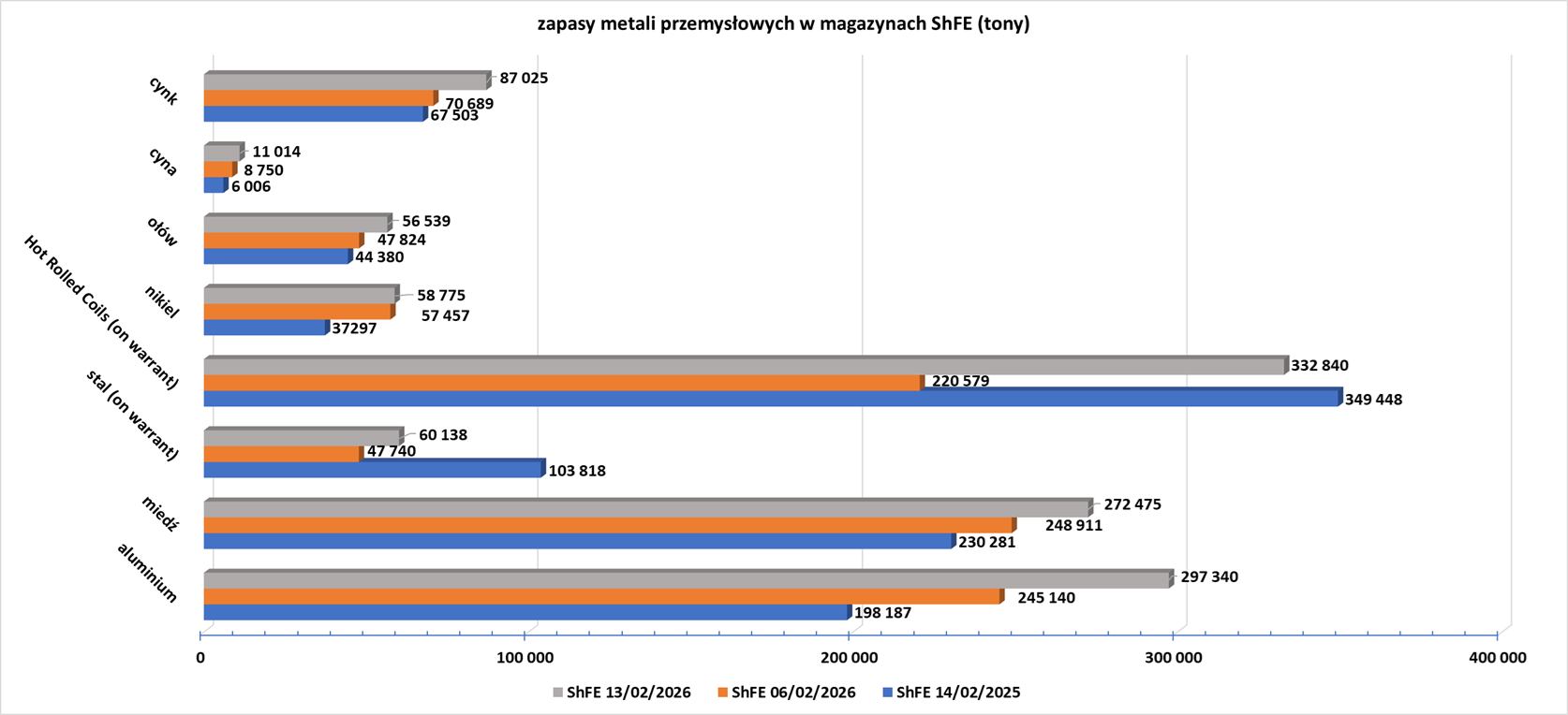 - Zapasy ropy naftowej w magazynach Shanghai Futures Exchange (ShFE) na dzień 13 lutego 2026 wynosiły 3,464 mln (b/z% t/t).