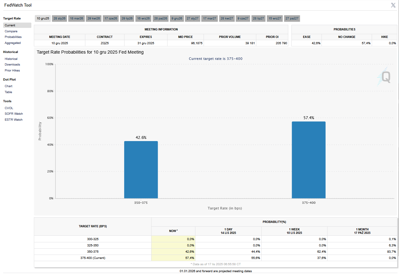 - FedWatch Tool (CME) na dzień 17 listopada 2025 dla grudniowego posiedzenia FOMC: