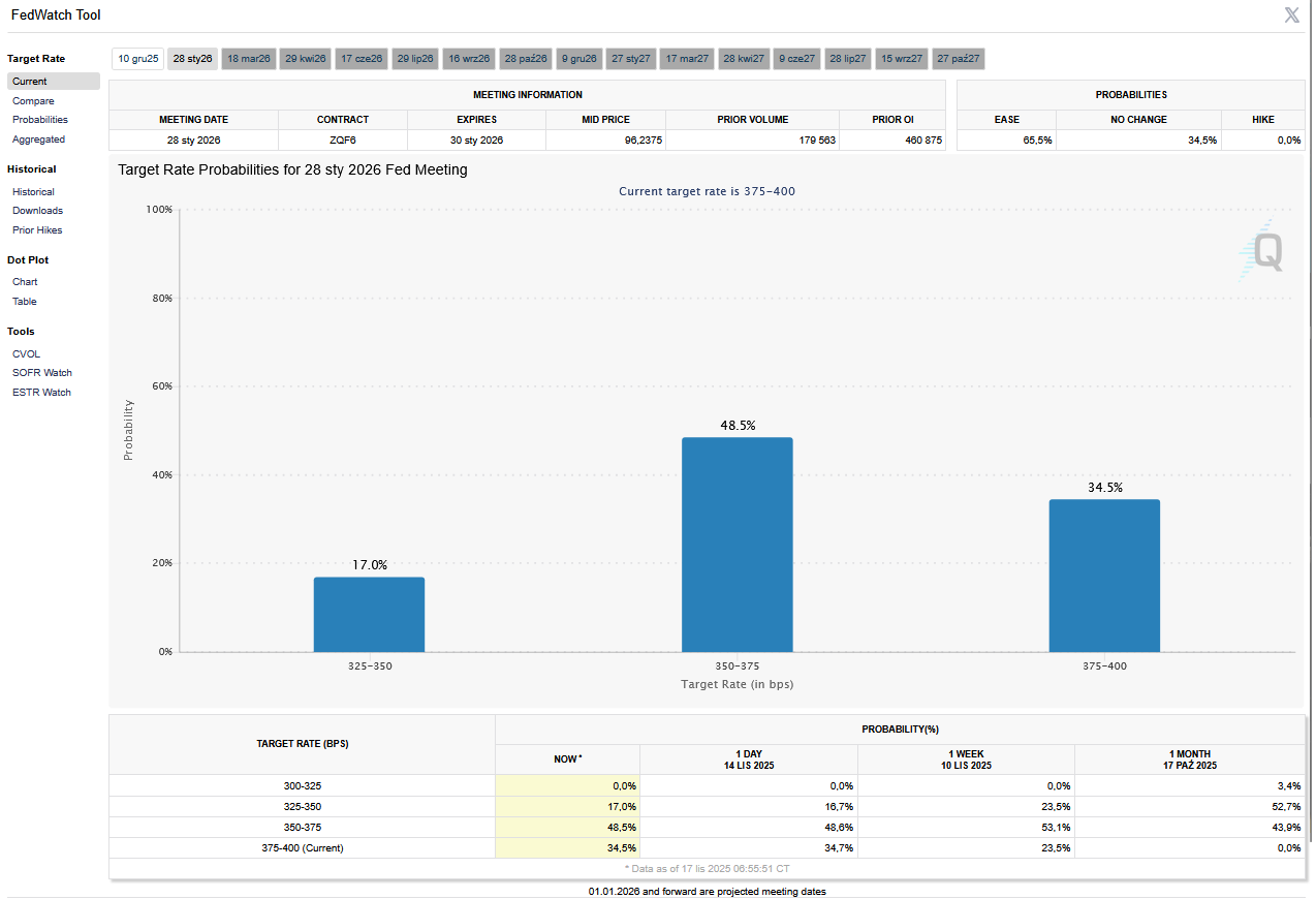 - FedWatch Tool (CME) na dzień 17 listopada 2025 dla styczniowego posiedzenia FOMC: