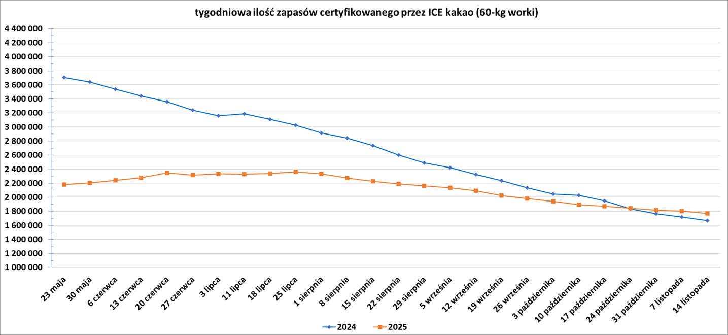 - Ekwador, trzeci co do wielkości producent kakao (a w sezonie 2025/26 prawdopodobnie wskoczy na drugie miejsce) na świecie, jest głównym źródłem zaopatrzenia w zapasy kakao z certyfikatem ICE.