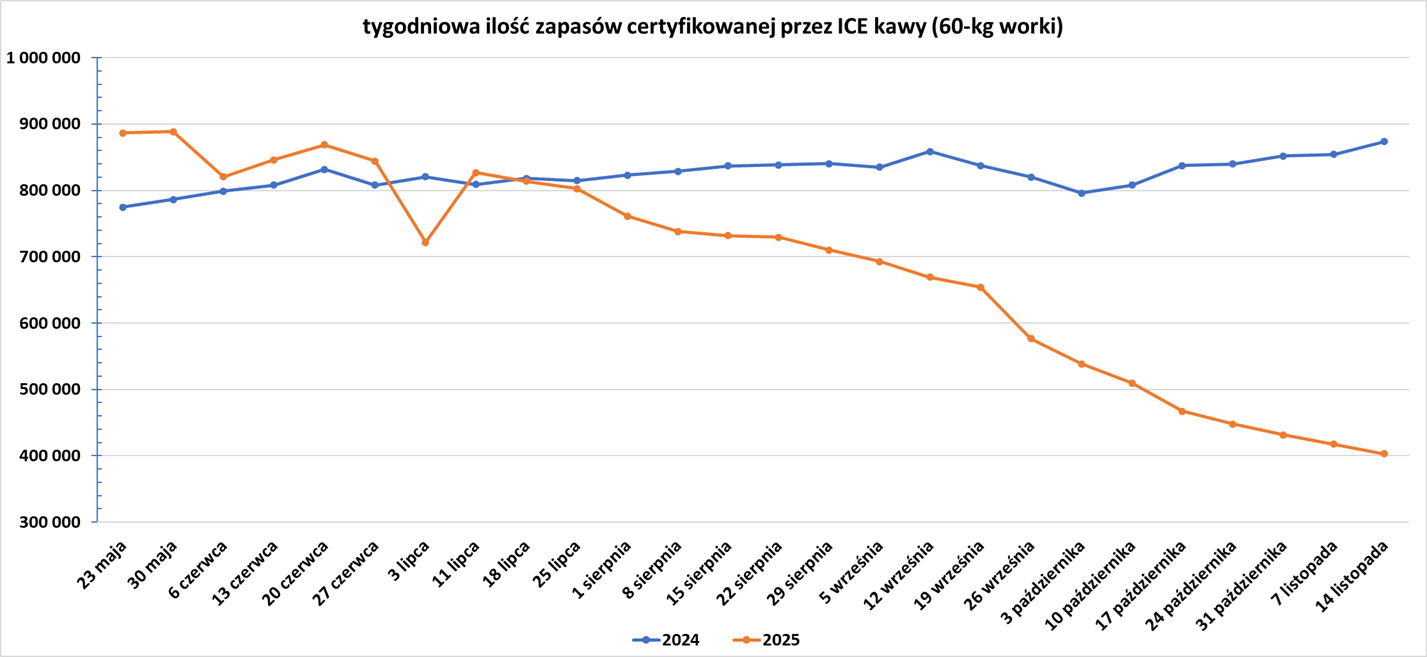 - Zapasy kawy w magazynach ICE spadły 18. tydzień z rzędu (-14,29k t/t), w poprzednim sezonie zmiana wynosiła +19,23k t/t. Zapasy są w tym sezonie niższe o -53,85% s/s. Na ocenę jakości oczekuje 37,344 tysięcy worków (+20,25k t/t).
