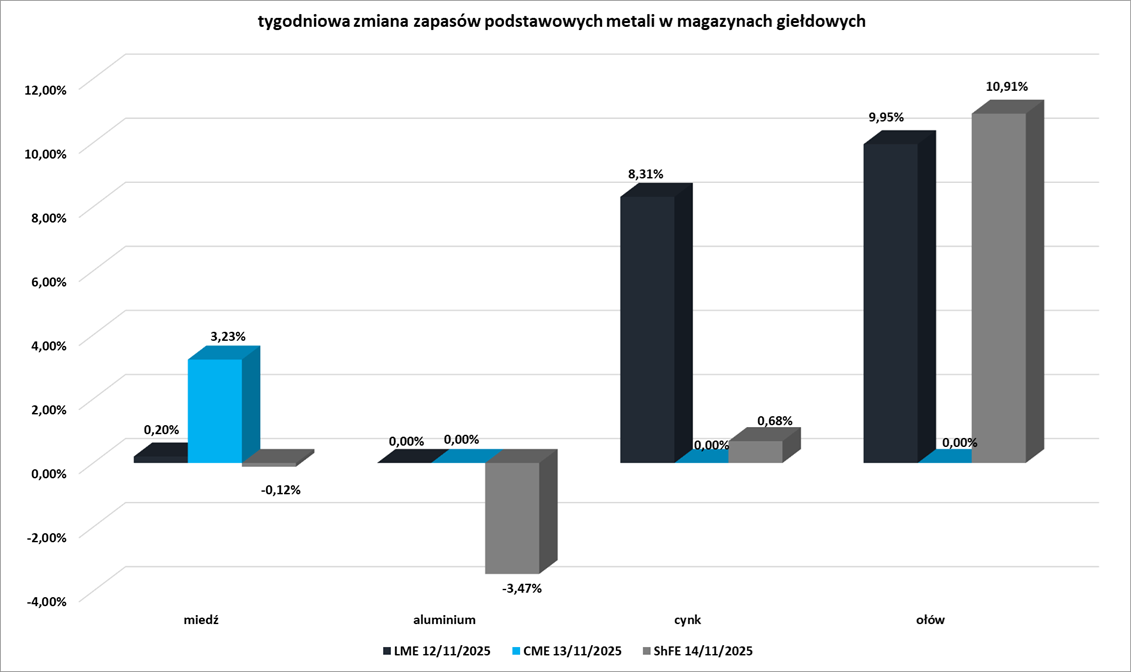 - Tygodniowe zmiany zapasów kluczowych metali przemysłowych w magazynach giełd CME (NYMEX & COMEX), szanghajskiej (ShFE) i londyńskiej (LME) giełdy: