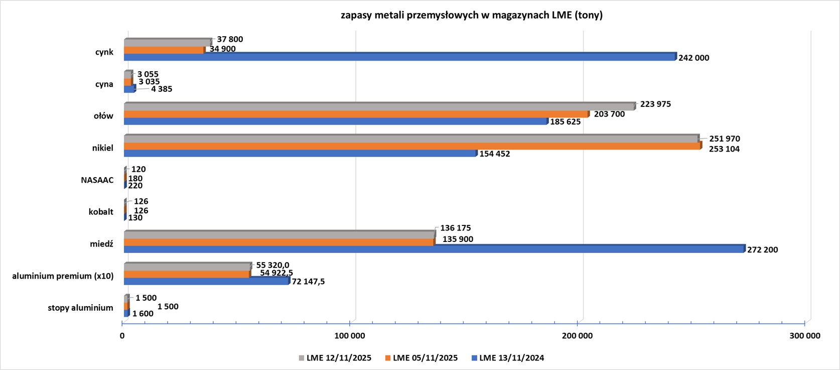 - Zapasy metali przemysłowych w magazynach Londyńskiej Giełdy Metali (LME):
