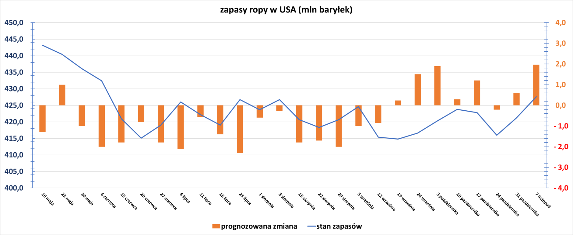 - Zapasy ropy naftowej w USA w tygodniu do 7 listopada zmieniły się o +6,4 mln baryłek, do 427,6 mln baryłek, prognozowano zmianę o +1,96 mln baryłek. Poniższy wykres pokazuje zmianę zapasów ropy w USA w ciągu ostatnich 26 tygodni: