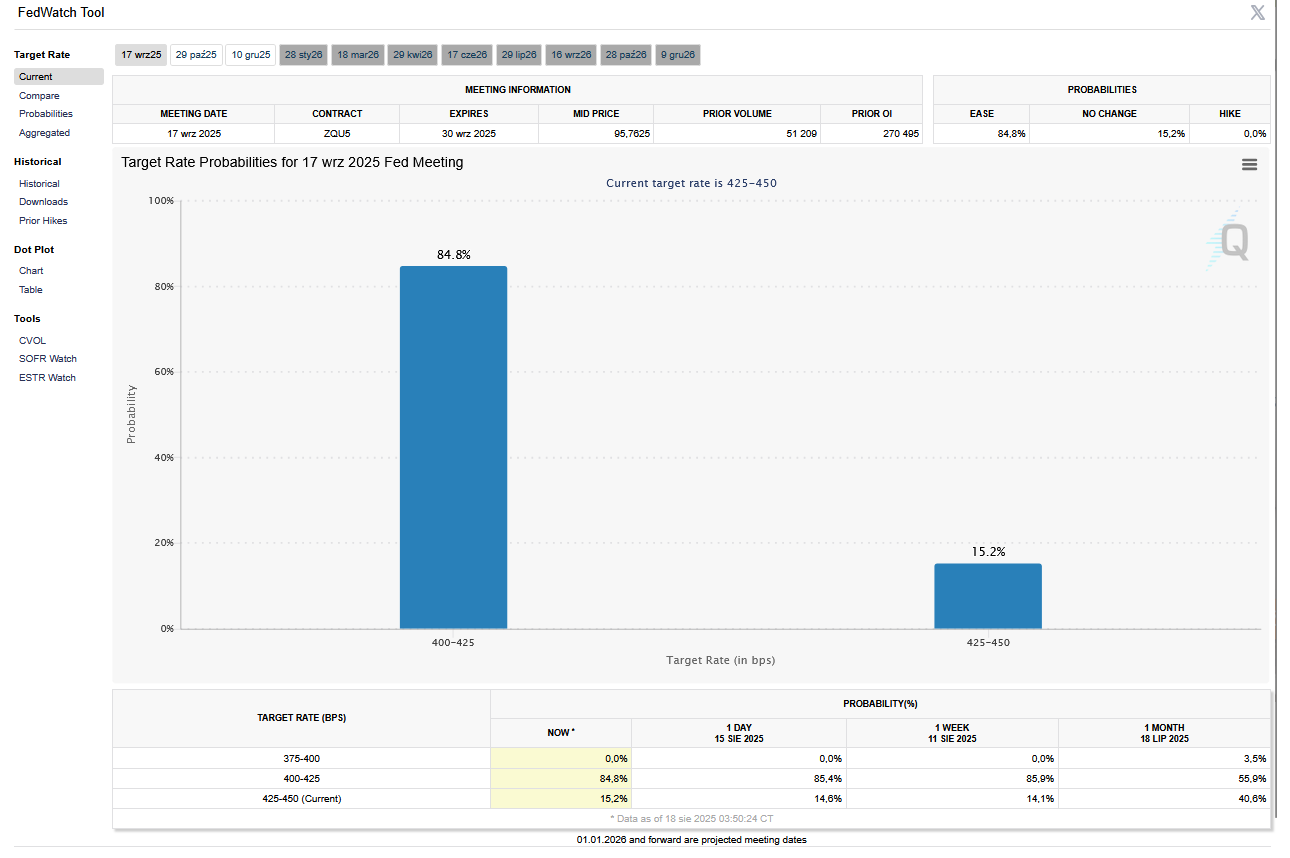- FedWatch Tool (CME) na dzień 18 sierpnia 2025 dla wrześniowego posiedzenia FOMC:
