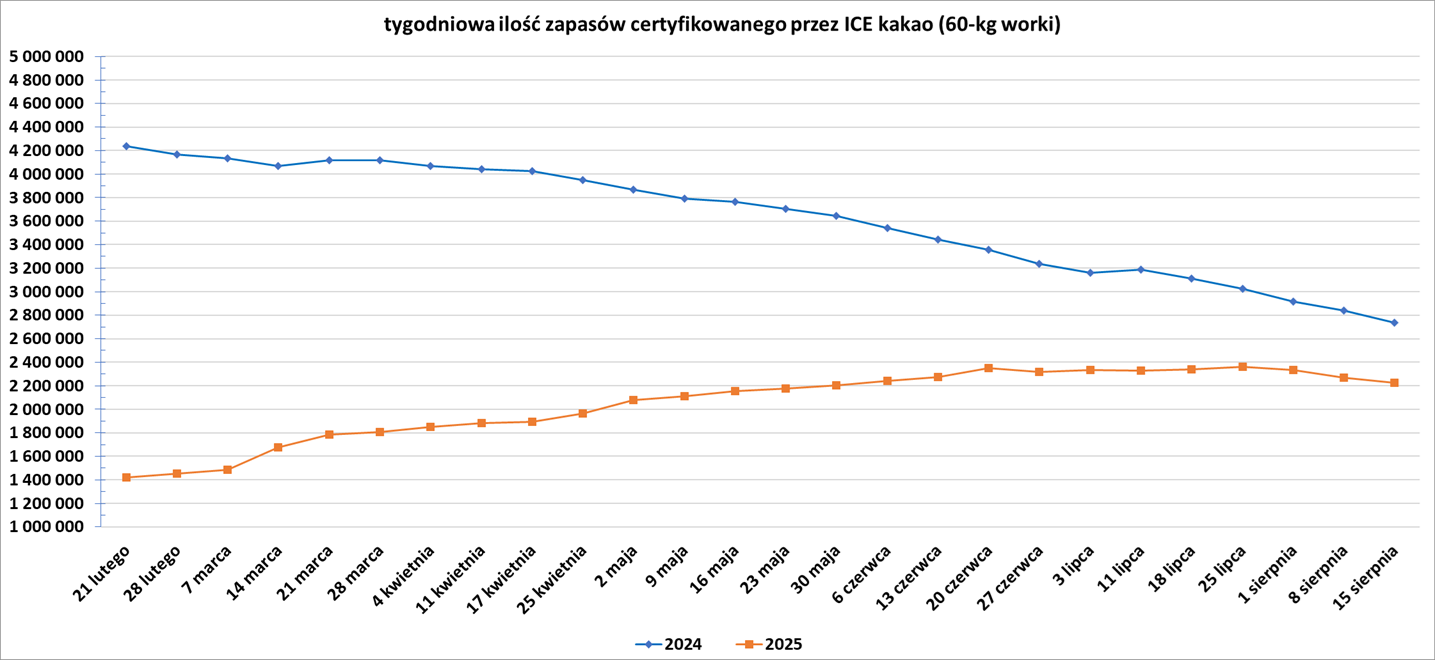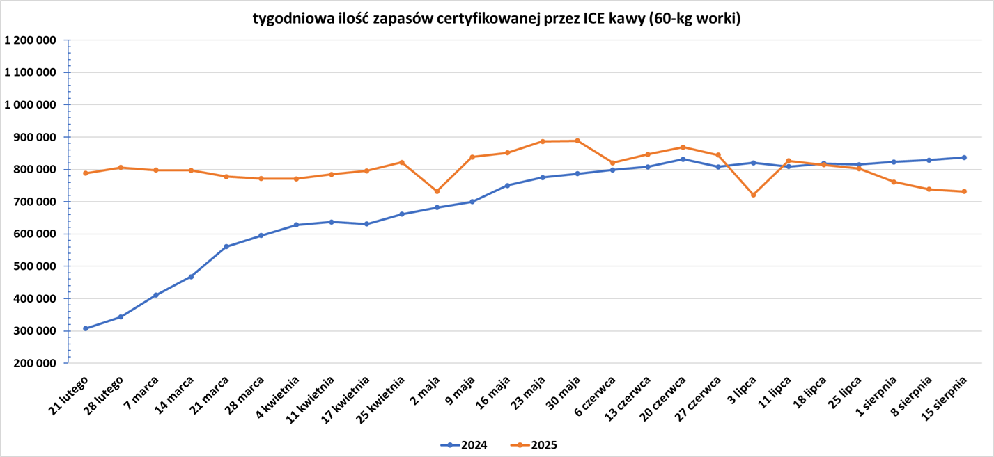 - Dealerzy twierdzą, że rynek był częściowo wspierany przez spadek zapasów certyfikowanych na giełdzie, które spadły do rocznego minimum, około 720 000 worków, ponieważ palarnie kawy szukają alternatywnych źródeł dostaw po nałożeniu 50% cła na import brazylijskiej kawy do USA. Brazylia dostarcza około jednej trzeciej importu kawy do USA. „W tej chwili nie ma żadnych umów z USA” – powiedział brazylijski broker.