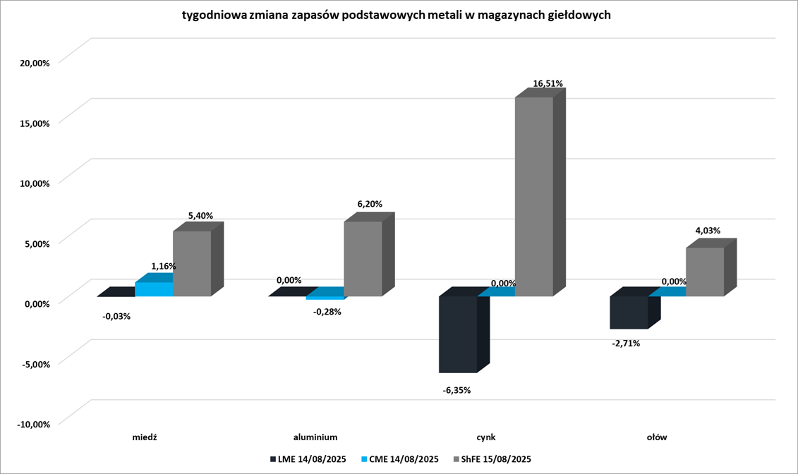 - Tygodniowe zmiany zapasów kluczowych metali przemysłowych w magazynach giełd CME (NYMEX & COMEX), szanghajskiej (ShFE) i londyńskiej (LME) giełdy: