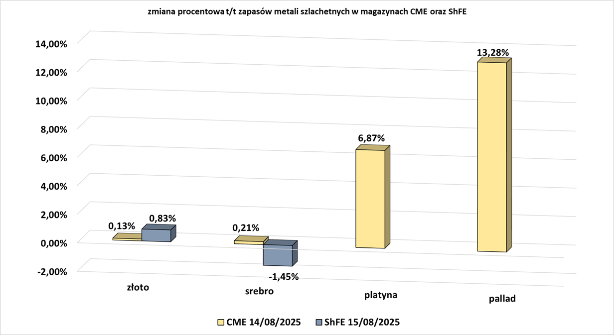 - Tygodniowe zmiany zapasów metali szlachetnych w magazynach giełd CME (NYMEX & COMEX) i szanghajskiej (ShFE):
