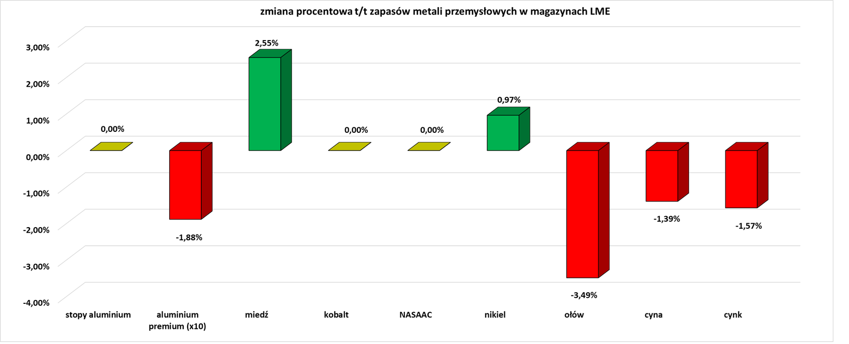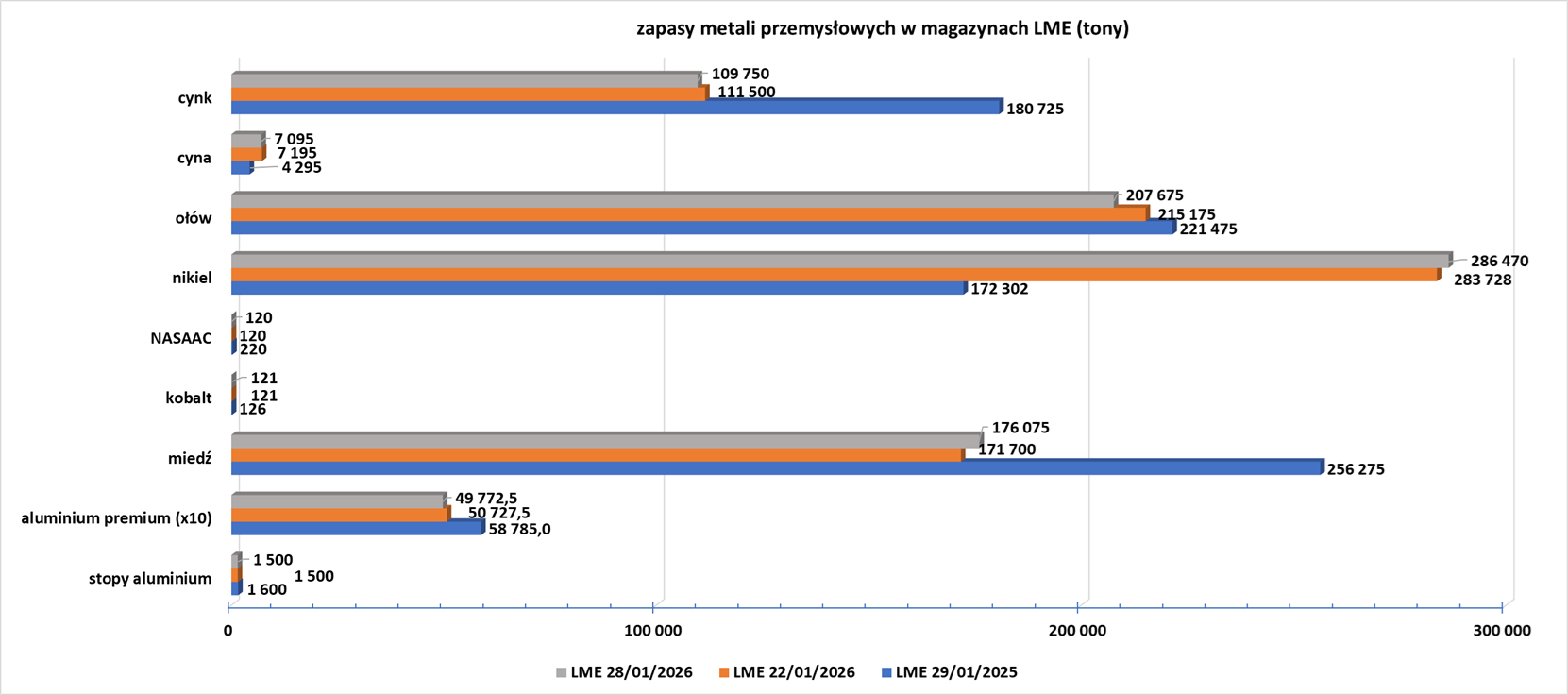 - Zapasy metali przemysłowych w magazynach Londyńskiej Giełdy Metali (LME):