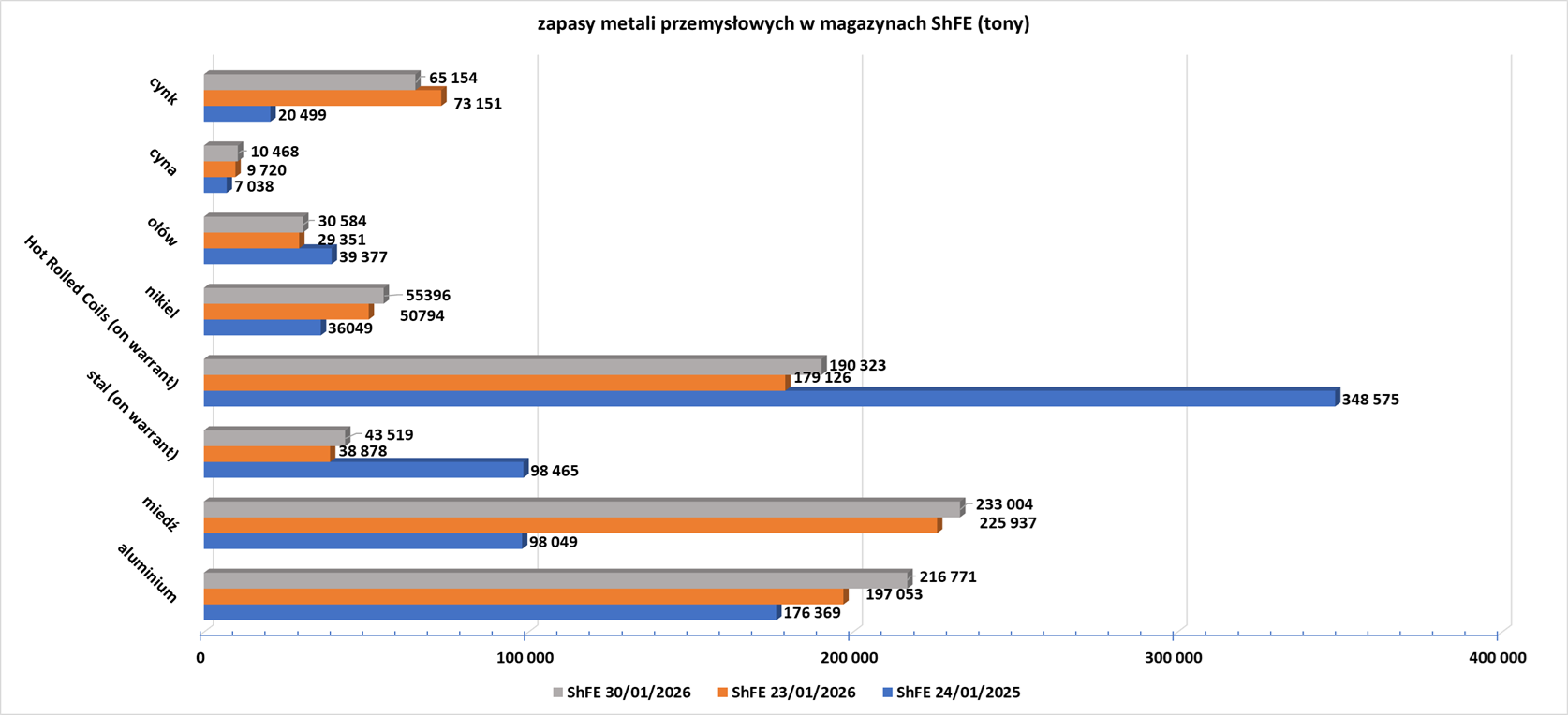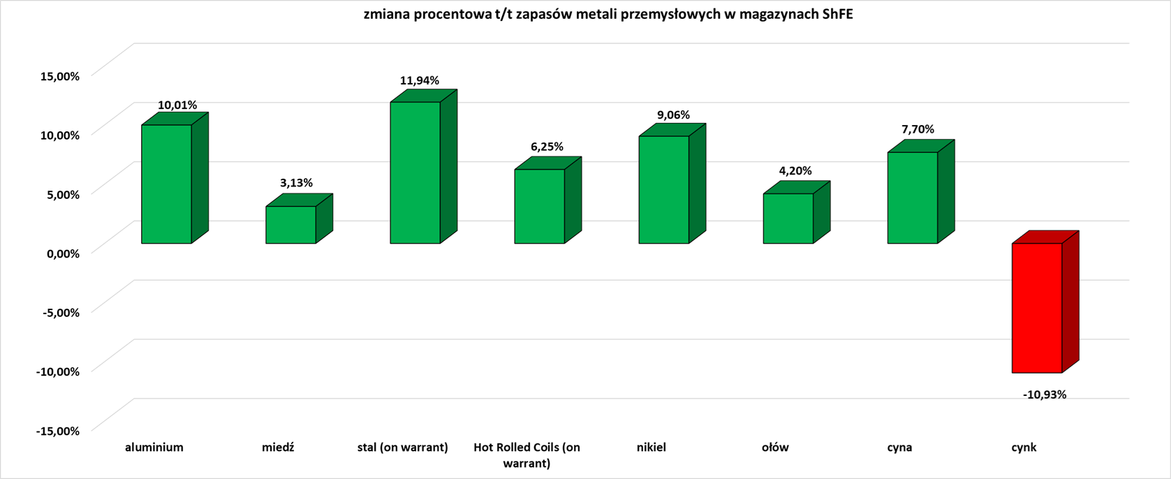 - Zapasy metali przemysłowych w magazynach Szanghajskiej Giełdy (ShFE):