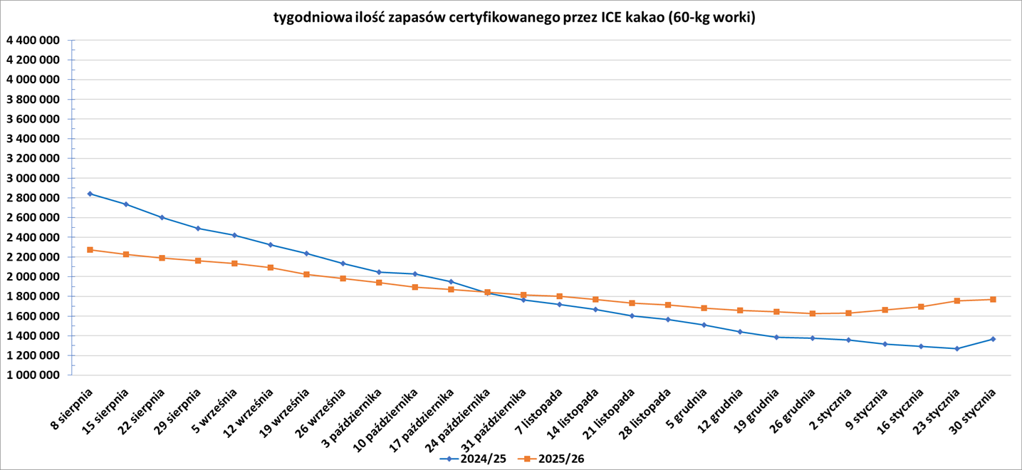 - Zapasy kakao w magazynach ICE wzrosły piąty tydzień z rzędu (+13,97k t/t), w poprzednim sezonie zmiana wynosiła +96,45k t/t. Zapasy są w tym sezonie o +29,49% s/s wyższe.