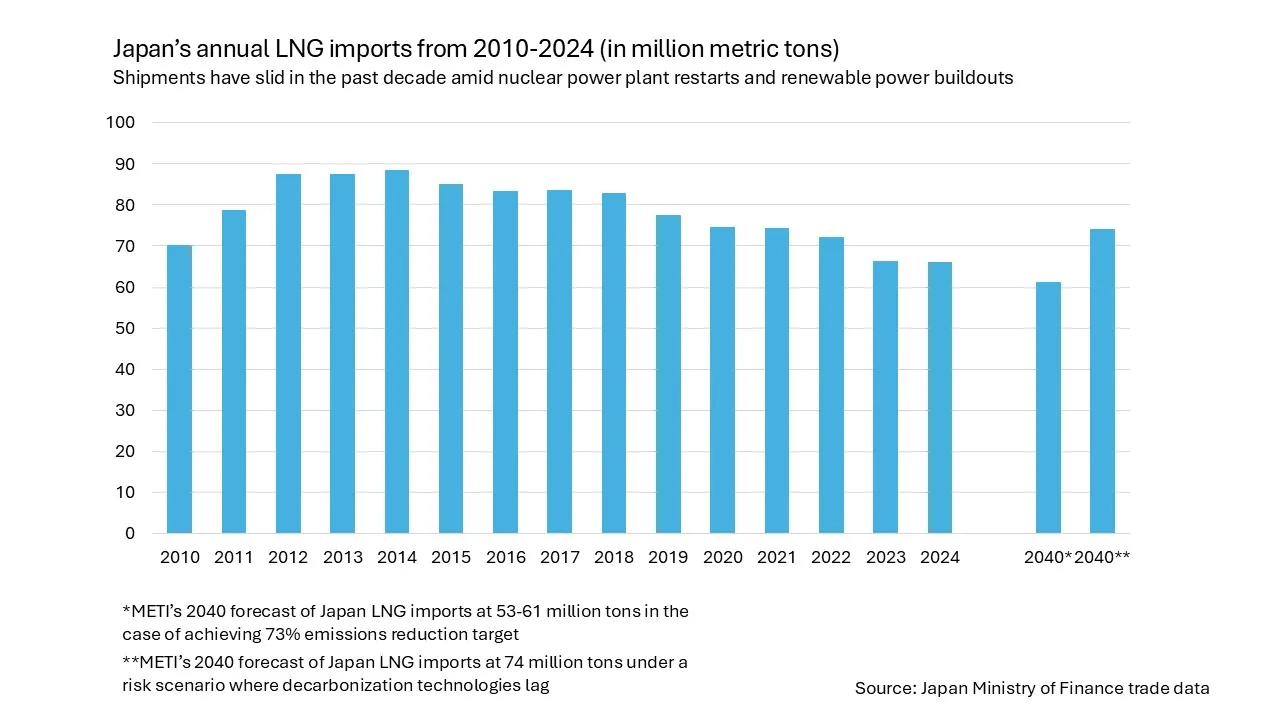 - Japonia znów znalazła się w centrum uwagi producentów skroplonego gazu ziemnego, ponieważ boom sztucznej inteligencji, rosnące koszty czystszej energii i nowy krajowy plan energetyczny zwiększają apetyt na długoterminowe umowy dotyczące LNG. Import LNG do Japonii spadał przez dekadę, ponieważ elektrownie jądrowe, wyłączone z użytku po katastrofie w Fukushimie, zostały ponownie uruchomione, a odnawialne źródła energii wzrosły. Import LNG przez Japonię od 2010 roku z prognozą na 2040 rok: