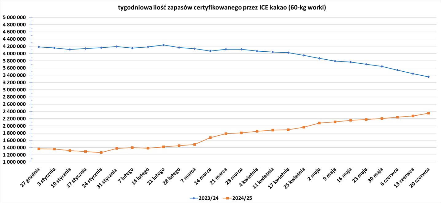 - Zapasy kakao w magazynach ICE wzrosły osiemnasty tydzień z rzędu (+72,48k t/t), w poprzednim sezonie spadły (-83,9k t/t). Zapasy są w tym sezonie o -30,09% s/s niższe.