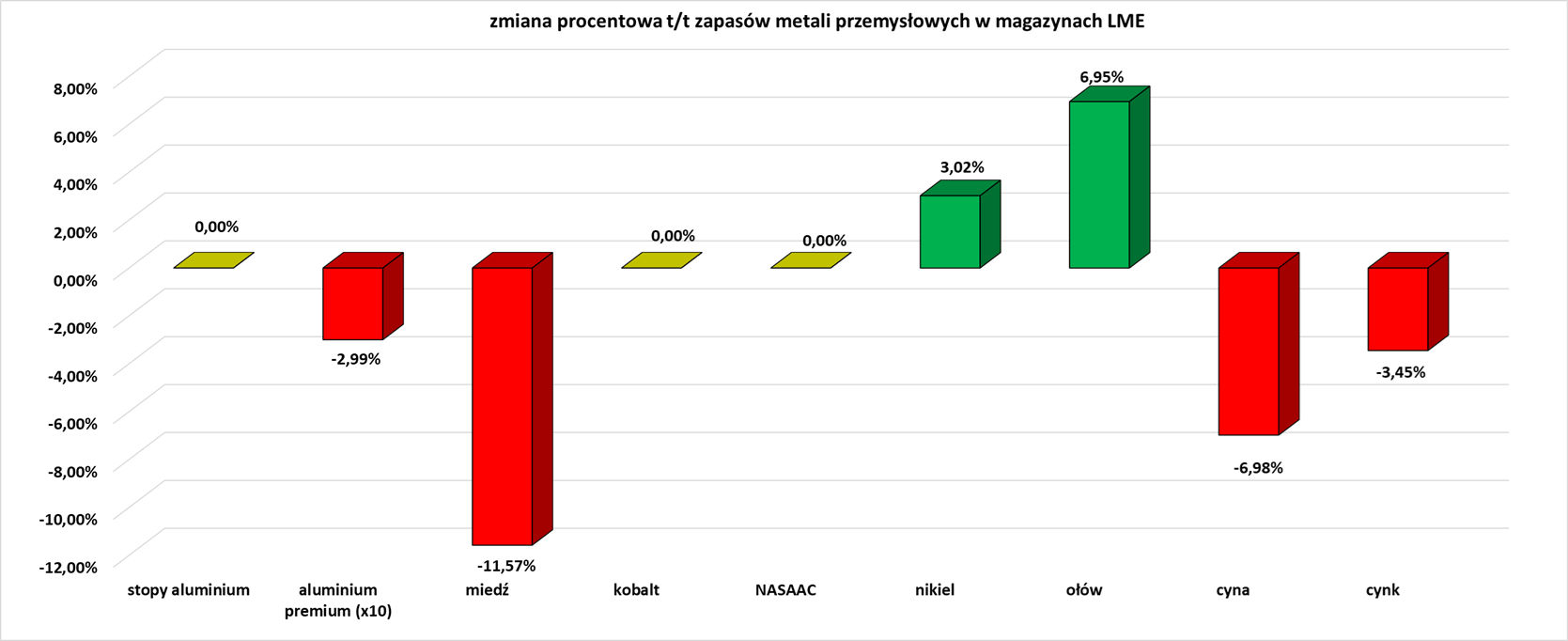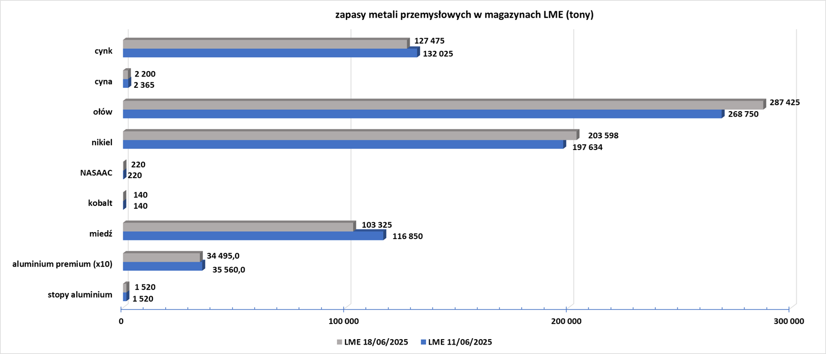 - Zapasy metali przemysłowych w magazynach Londyńskiej Giełdy Metali (LME):
