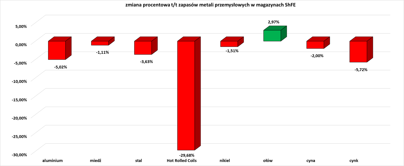 - Zapasy metali przemysłowych w magazynach Szanghajskiej Giełdy (ShFE):