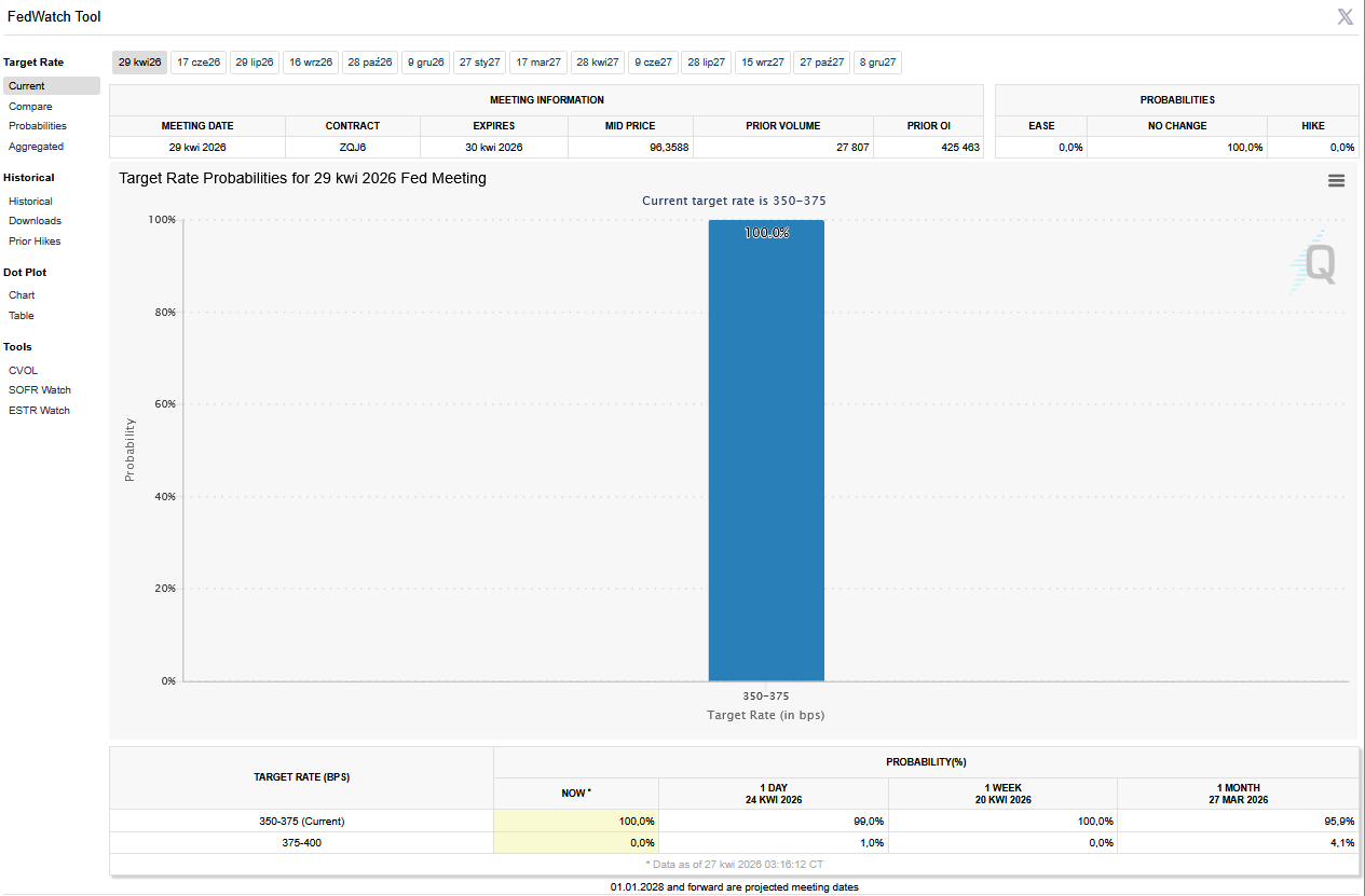 - FedWatch Tool (CME) na dzień 27 kwietnia 2026 dla kwietniowego posiedzenia FOMC: