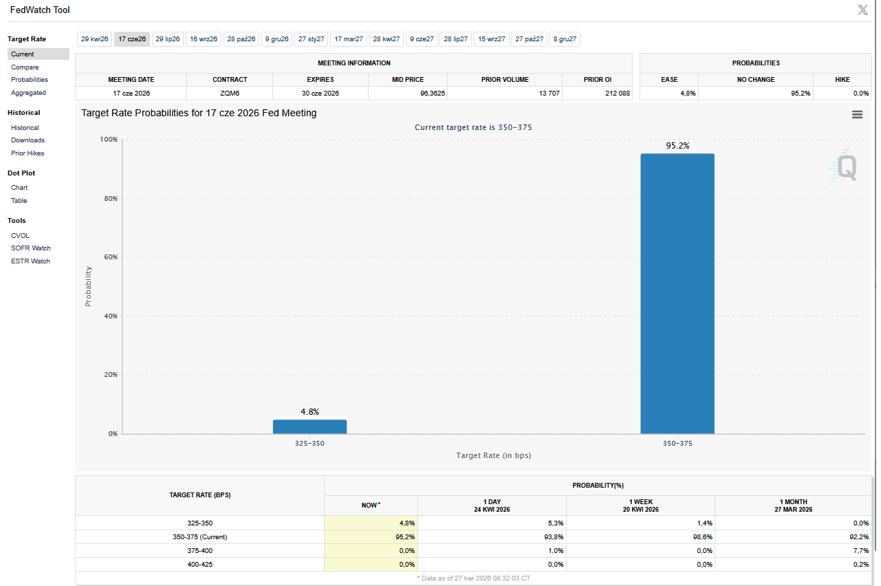 - FedWatch Tool (CME) na dzień 27 kwietnia 2026 dla czerwcowego posiedzenia FOMC: