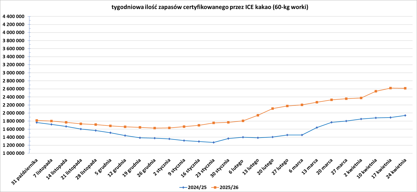 - Zapasy kakao w magazynach ICE spadły (-3,77k t/t), w poprzednim sezonie zmiana wynosiła +48,59k t/t. Zapasy są w tym sezonie o +34,82% s/s wyższe.