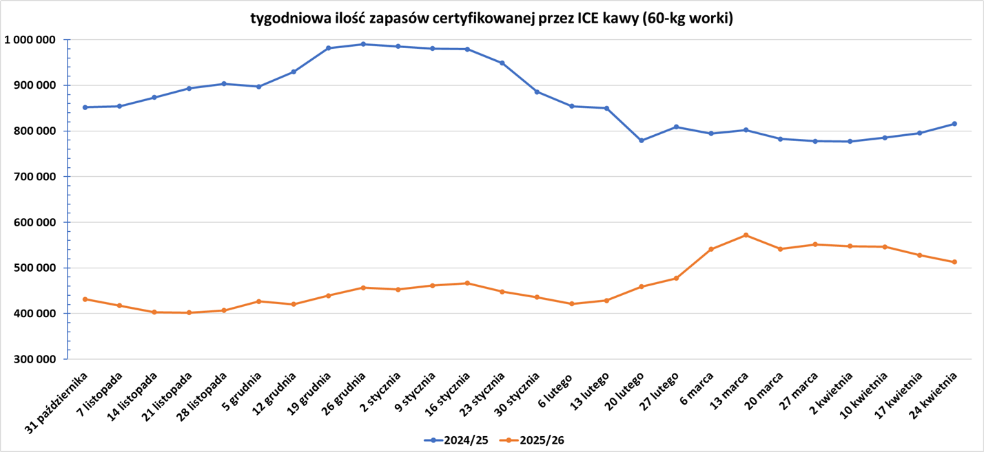 - „Zapasy kawy Arabica z certyfikatem spadają i obecnie wynoszą 515 000 worków, ponieważ napływ kawy do ICE (zwłaszcza do Ameryki Środkowej) maleje. Wolumen oczekujący na inspekcję to skromne 20 700 worków i jak dotąd nie rośnie w kwietniu” – powiedział Ryan Delany, główny analityk Coffee Trading Academy (CTA).