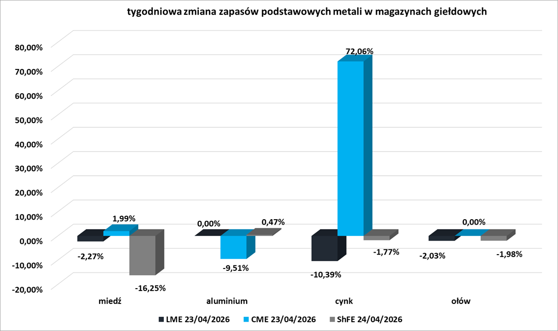- Tygodniowe zmiany zapasów kluczowych metali przemysłowych w magazynach giełd CME (NYMEX & COMEX), szanghajskiej (ShFE) i londyńskiej (LME) giełdy:
