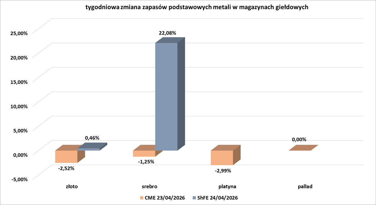 - Tygodniowe zmiany zapasów metali szlachetnych w magazynach giełd CME (NYMEX & COMEX) i szanghajskiej (ShFE):