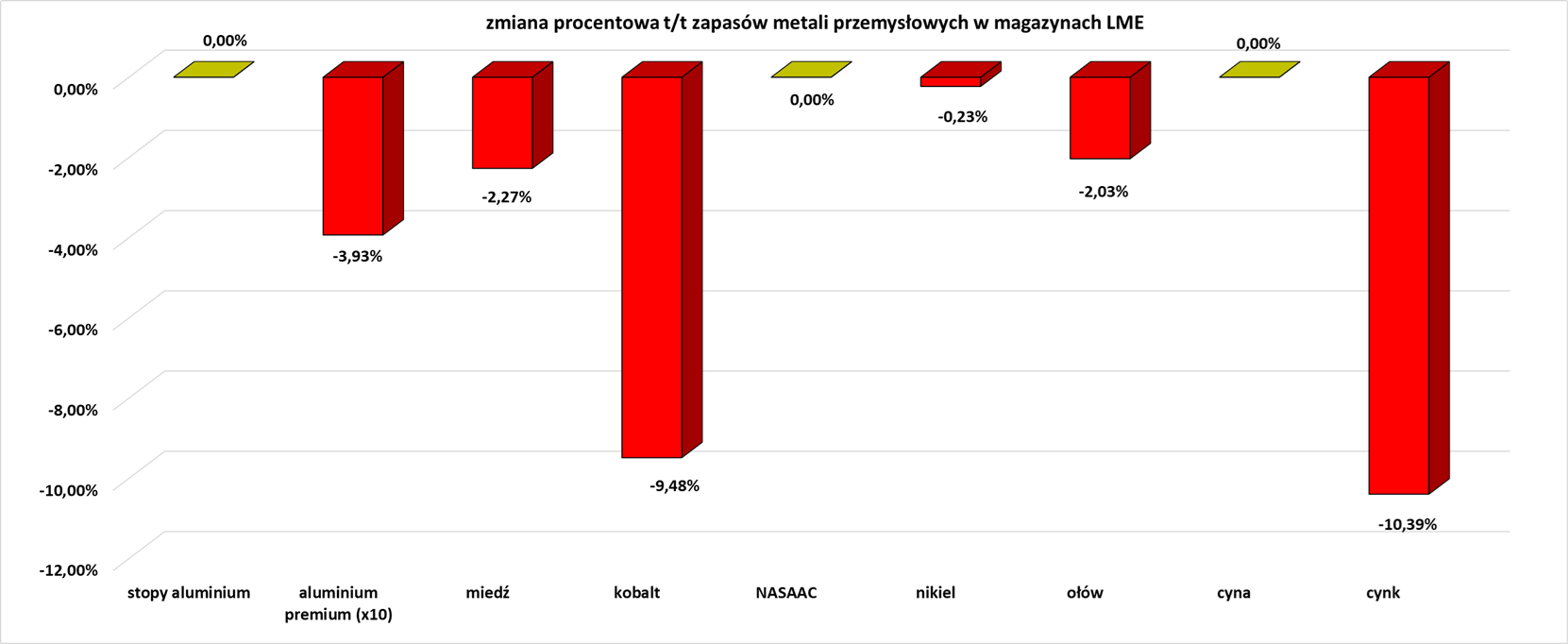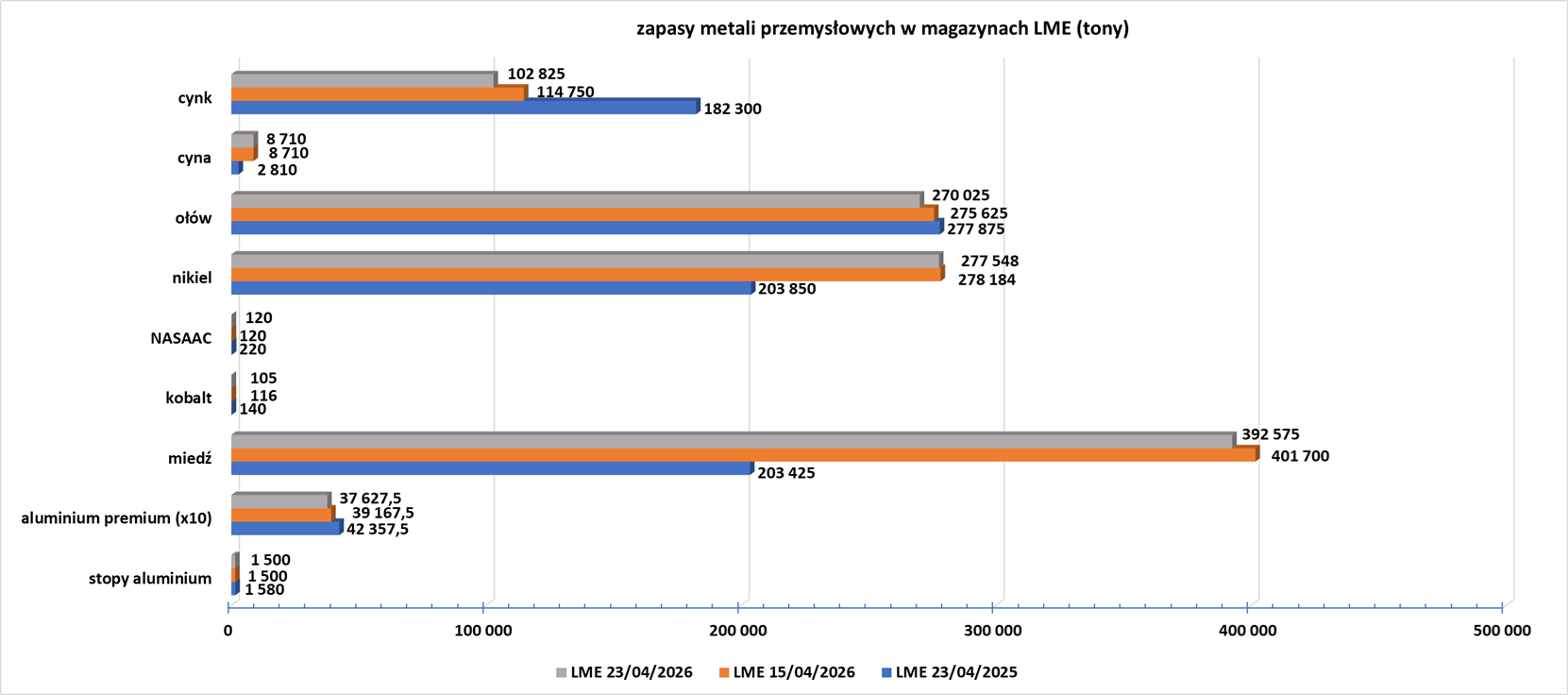 - Zapasy metali przemysłowych w magazynach Londyńskiej Giełdy Metali (LME):