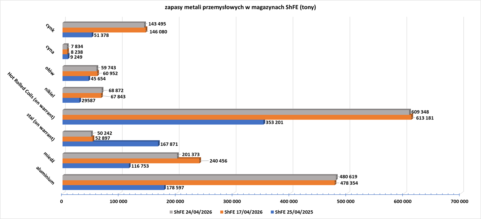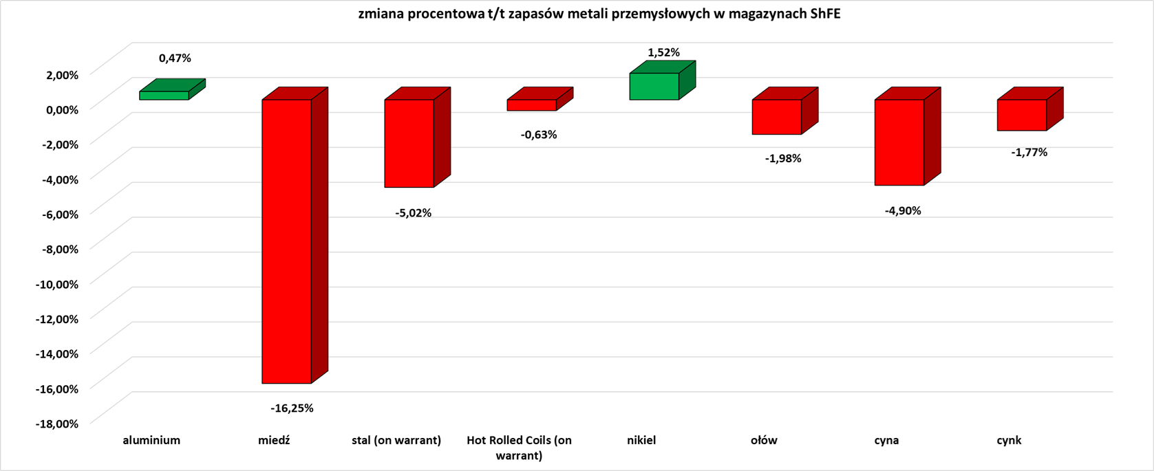 - Zapasy metali przemysłowych w magazynach Szanghajskiej Giełdy (ShFE):