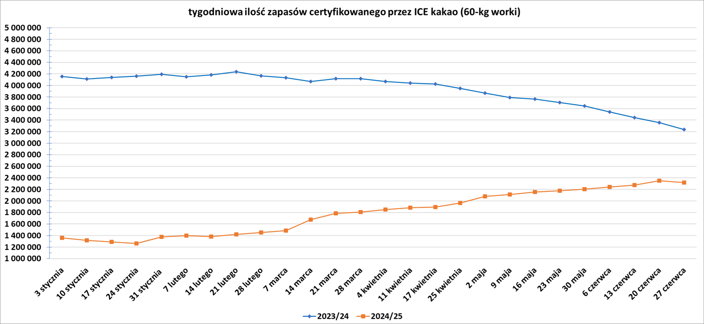 - Zapasy kakao w magazynach ICE spadły (-33,0k t/t), w poprzednim sezonie spadły (-121,5k t/t). Zapasy są w tym sezonie o -28,49% s/s niższe.