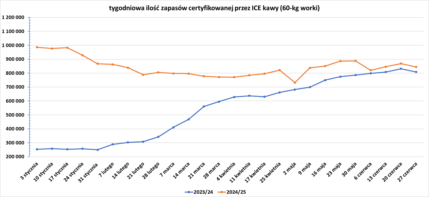 - Zapasy kawy w magazynach ICE spadły (-24,3k t/t), w poprzednim sezonie spadły (-23,4k t/t). Zapasy są w tym sezonie wyższe o +4,47% s/s. Na ocenę jakości oczekuje 29,43 tysięcy worków (-11,55k t/t).