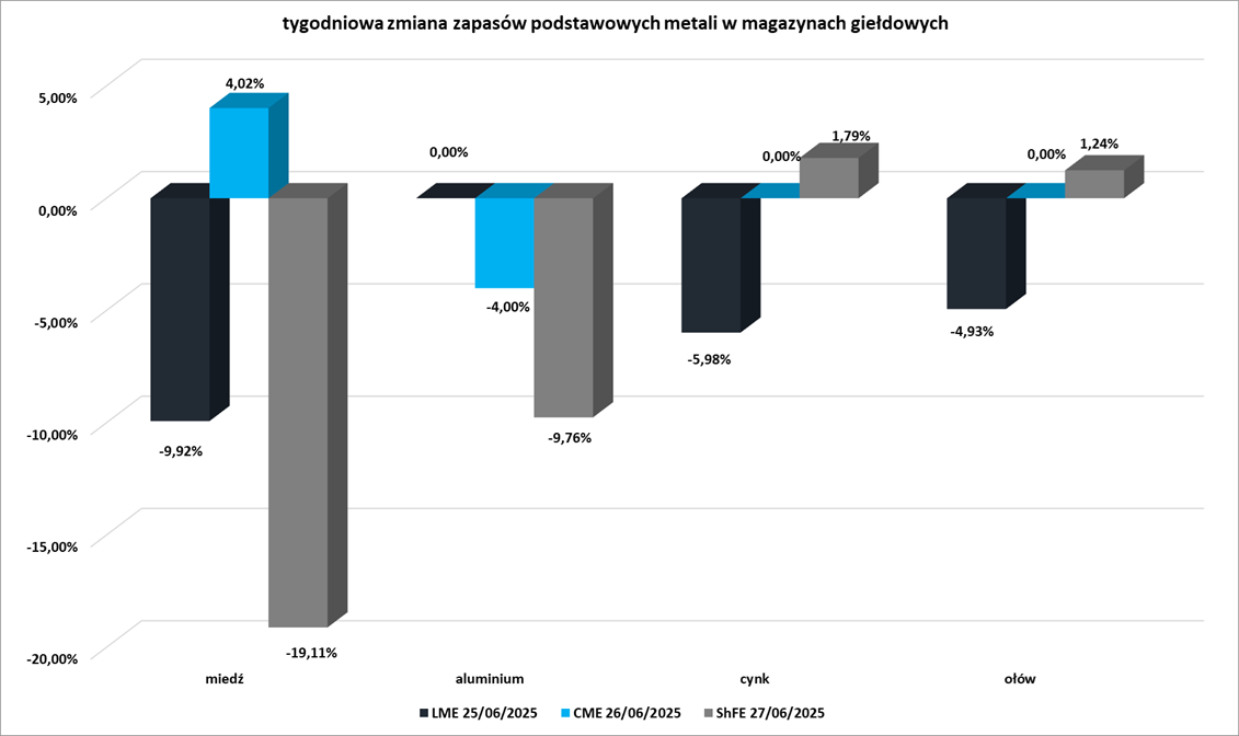 - Tygodniowe zmiany zapasów kluczowych metali przemysłowych w magazynach giełd CME (NYMEX & COMEX), szanghajskiej (ShFE) i londyńskiej (LME) giełdy: