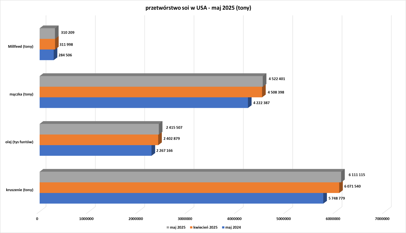 - Przerób soi na olej w USA w maju 2025 wyniósł 6,11 mln ton (+0,66% m/m; +6,26% r/r). Pozostałe dane o przerobie soi (USDA):