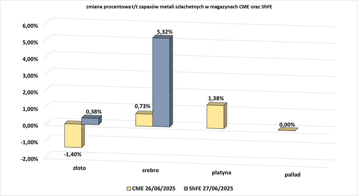 - Tygodniowe zmiany zapasów metali szlachetnych w magazynach giełd CME (NYMEX & COMEX) i szanghajskiej (ShFE):