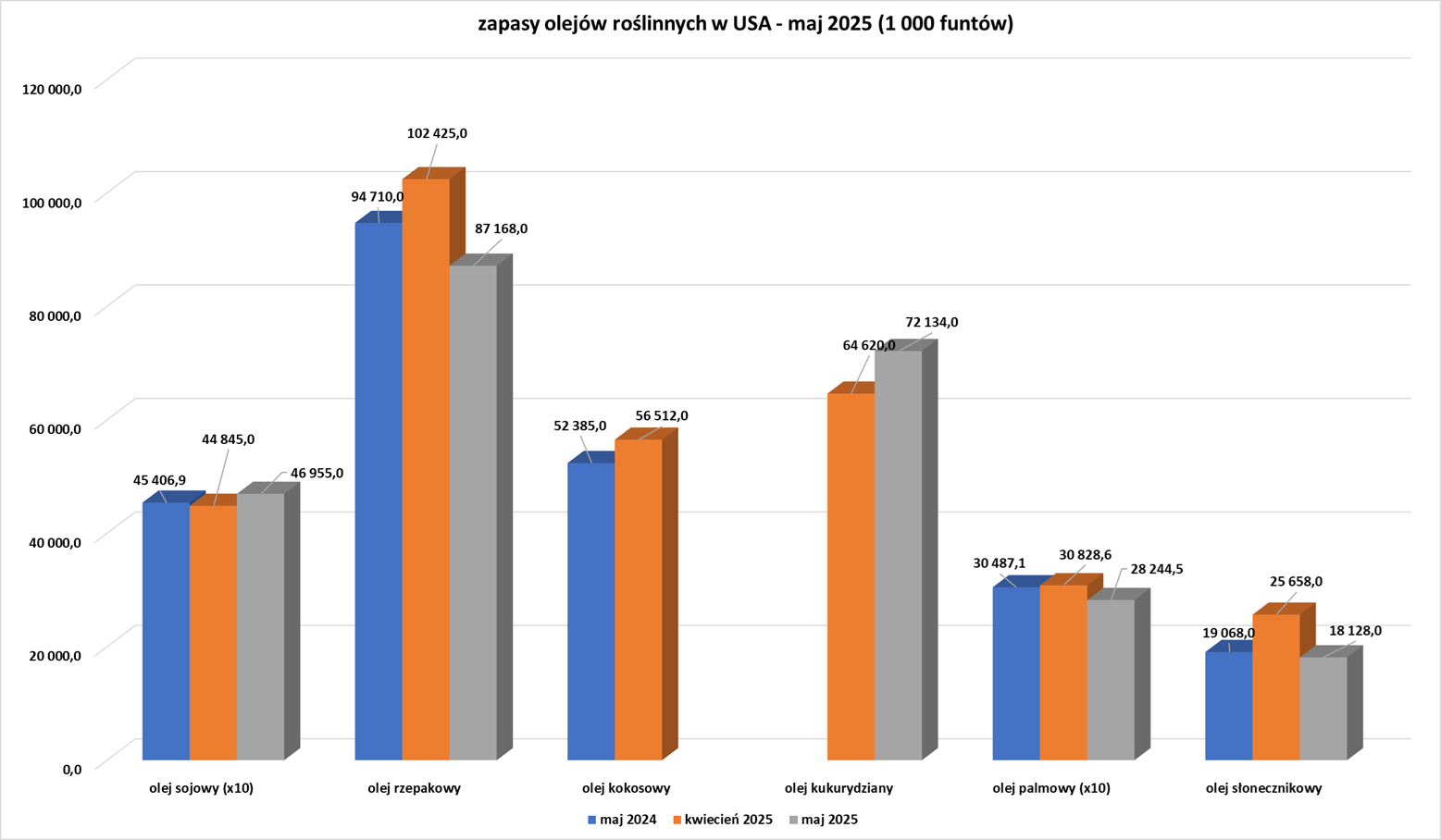 - Przerób rzepaku na olej w USA w maju 2025 wyniósł 107 840 ton (-33,02% m/m; -24,83% r/r).