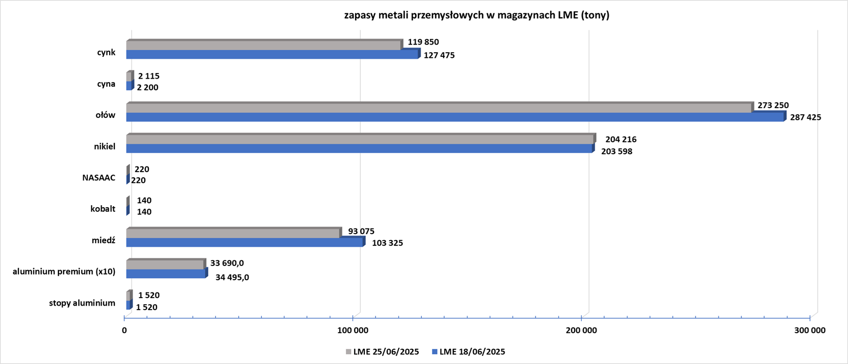 - Zapasy metali przemysłowych w magazynach Londyńskiej Giełdy Metali (LME):