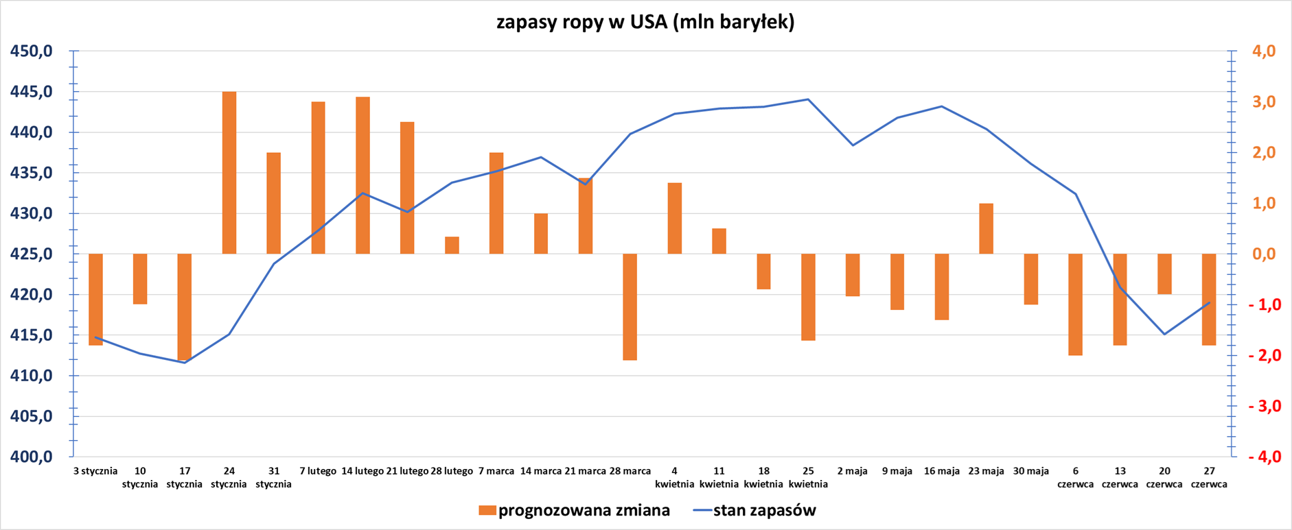 - Zapasy ropy naftowej w USA w tygodniu do 27 czerwca zmieniły się o +3,8 mln baryłek, do 419,0 mln baryłek, prognozowano zmianę o -1,8 mln baryłek. Poniższy wykres pokazuje zmianę zapasów ropy w USA w ciągu ostatnich 26 tygodni: